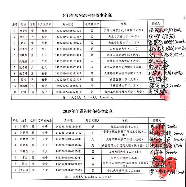 經(jīng)統(tǒng)計,2019年以殷家灣村和羊道溝村為生源地的在讀生共19人,省安投公司對幫扶村的19名在校生給予34200元助學(xué)金(一本助學(xué)金2500元/人,二本助學(xué)金2000元/人,三本助學(xué)金1700元/人,大專助學(xué)金1500元/人,職高助學(xué)金1000元/人),并建立長效機制。